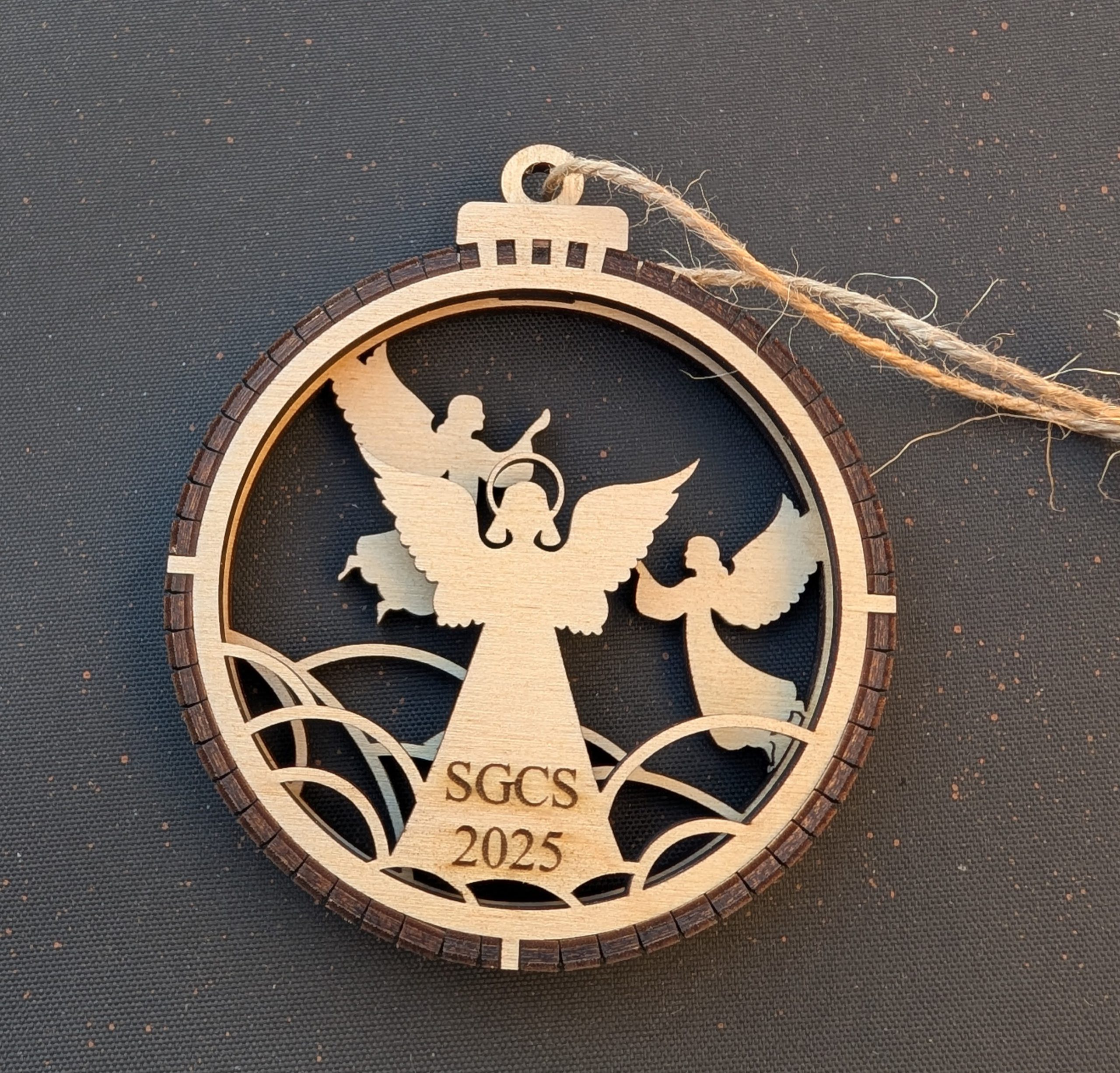 This ornament is made of laser cut 3mm wood. It’s roughly 3″ in diameter and weighs less than half an ounce. It has dual layers so has a 3d effect when viewed.