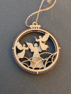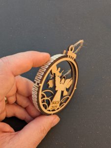 This ornament is made of laser cut 3mm wood. It’s roughly 3″ in diameter and weighs less than half an ounce.
